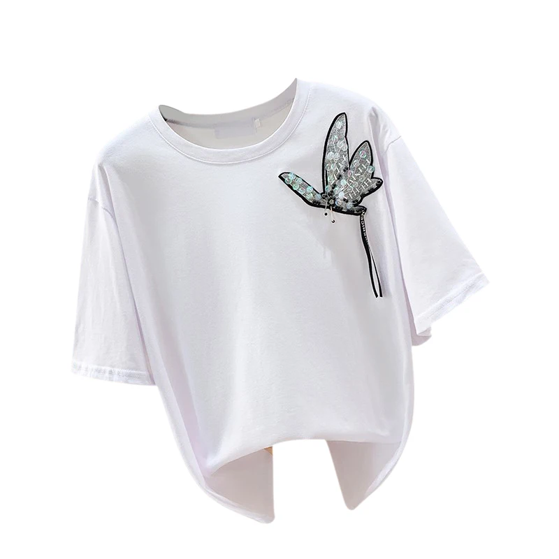 Images of 2020 Spring Summer New Korean Fashion Embroidered Sequined Butterfly Short-Sleeve Round-Neck T-shirt Women's Loose-Fit Casual T :