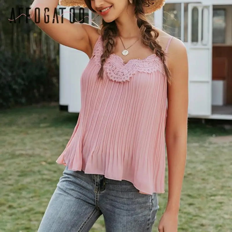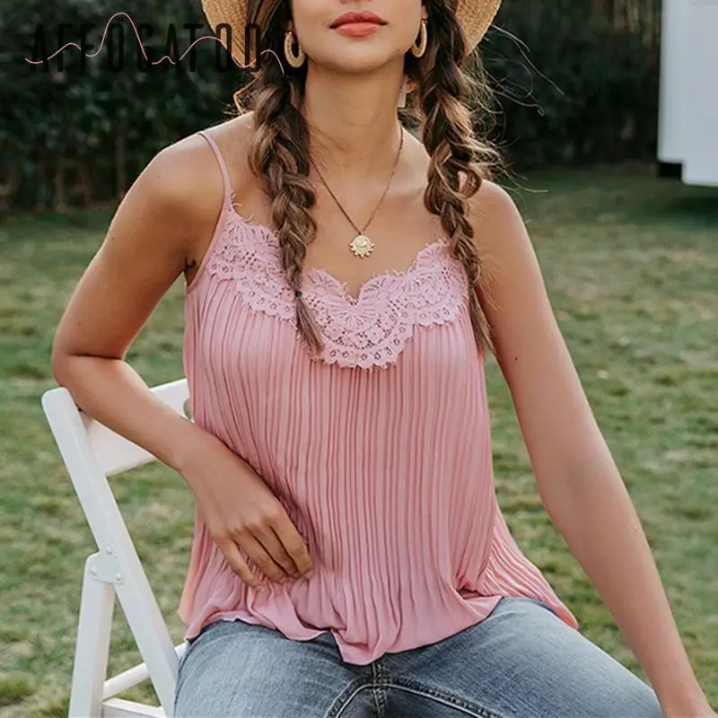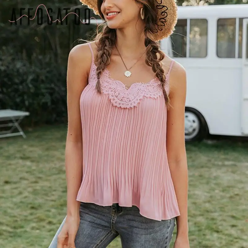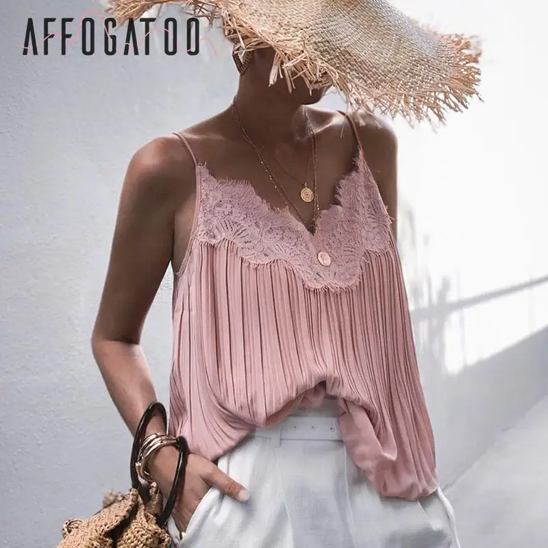 Sale Affogatoo Sexy v-neck lace pink tops camis women Elegant embroidery tank top female Casual holiday beach strap top shirts ladies