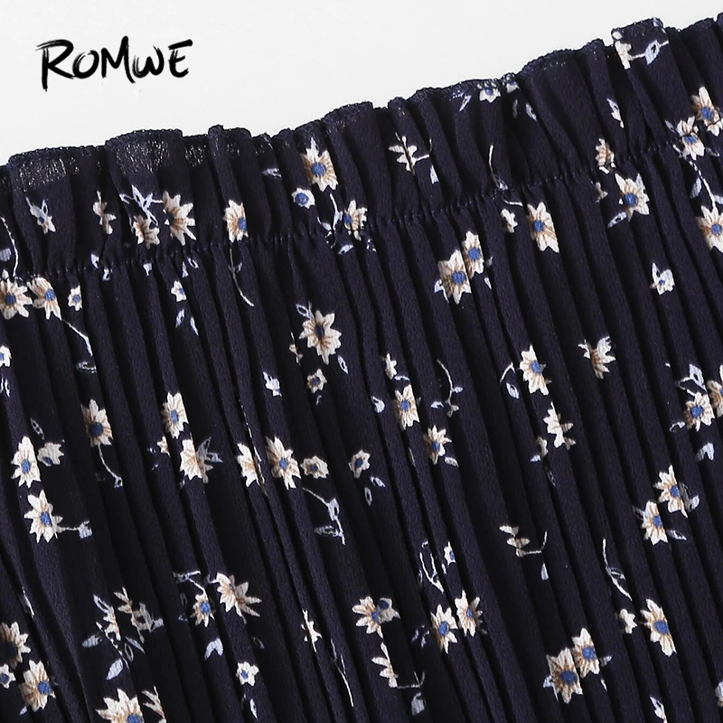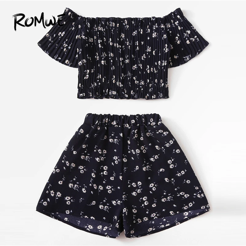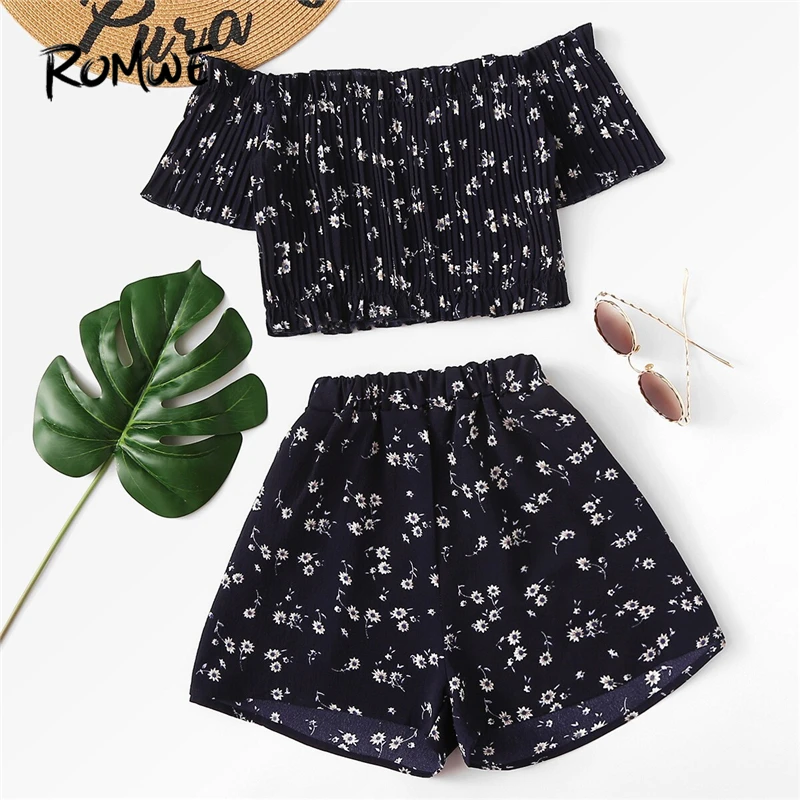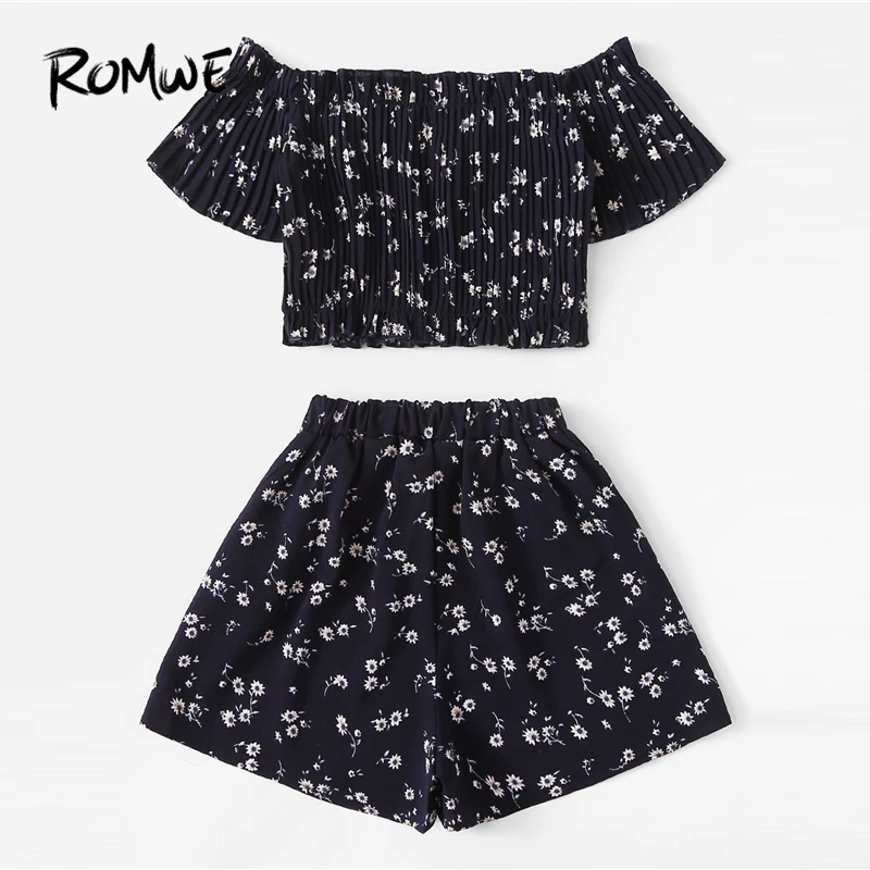 Best Offer ROMWE Navy Off Shoulder Floral Frill Crop Top With Shorts Two-Pieces Sets Women Bohemian Beach Style Summer Short Co-ords