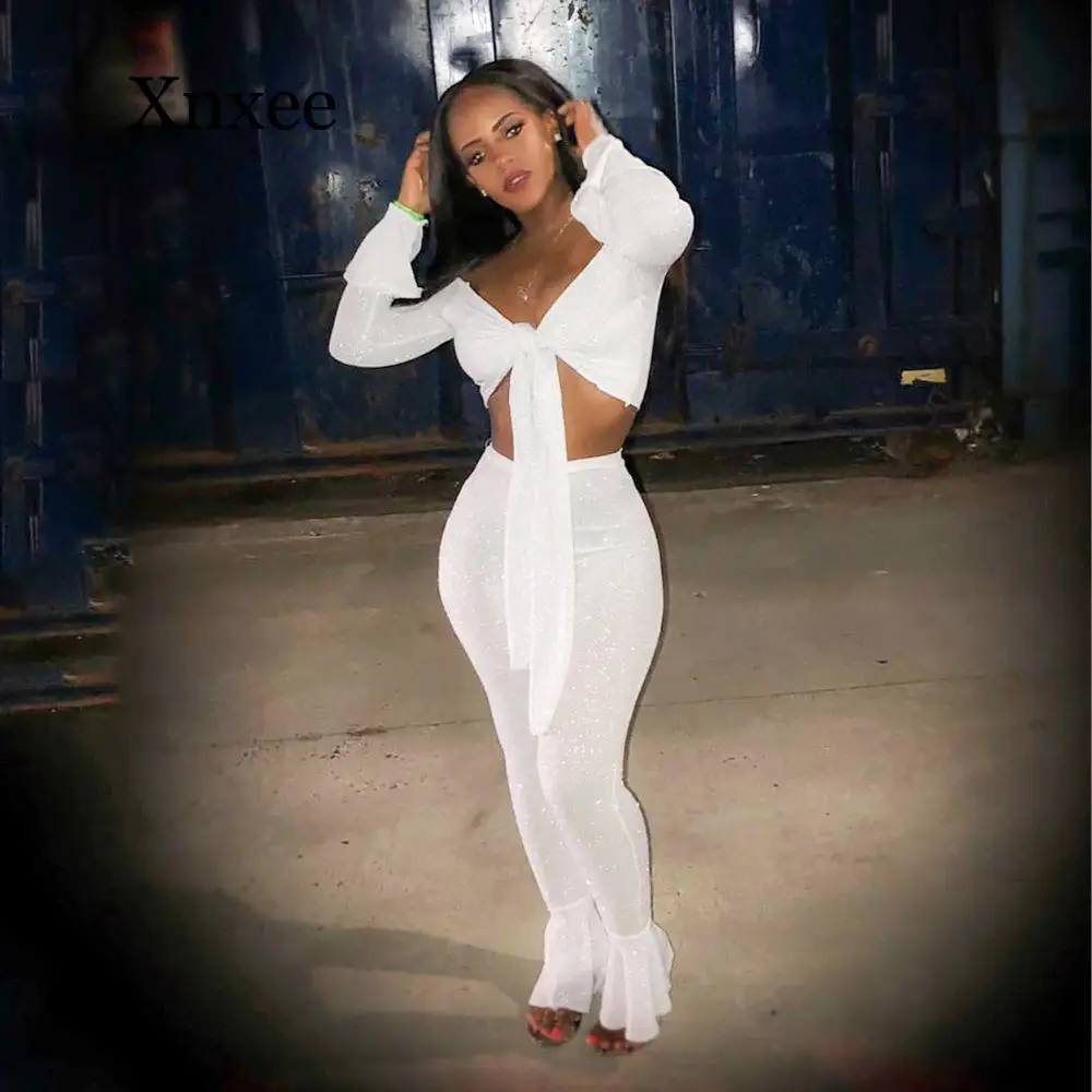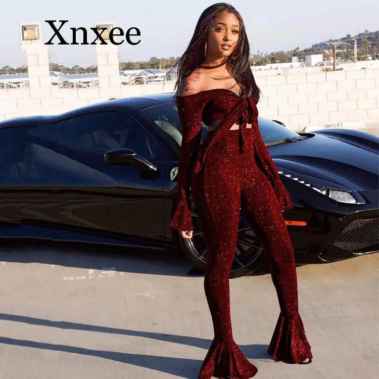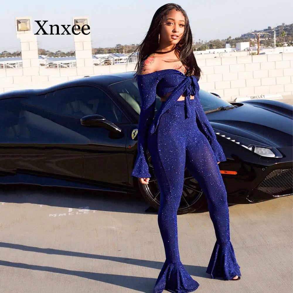 Best Offer Sexy Shining Wire 2 Piece Suit Woman Crop Top Tie Bow Off Shoulder Flare Sleeve+ Skinny Pants High Stretchy slash neck summer