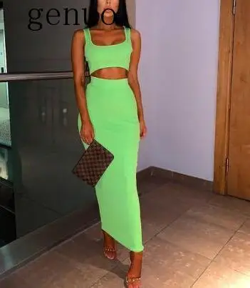 Best Offer Summer 2020 New Hot Style Pure Color Women Two-Piece Set Tight Tank Top Vest And Dress Sleeveless Temperament Lady Suit
