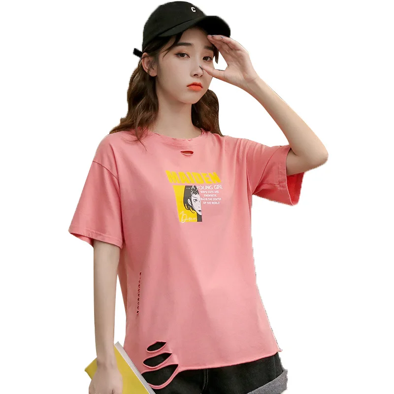 New Cotton Loose Hole Print T-shirt Women's Short Sleeve Cute Kawaii Pink Tshirt Girl Graphic Harajuku T Shirt Casual Top Female Cec