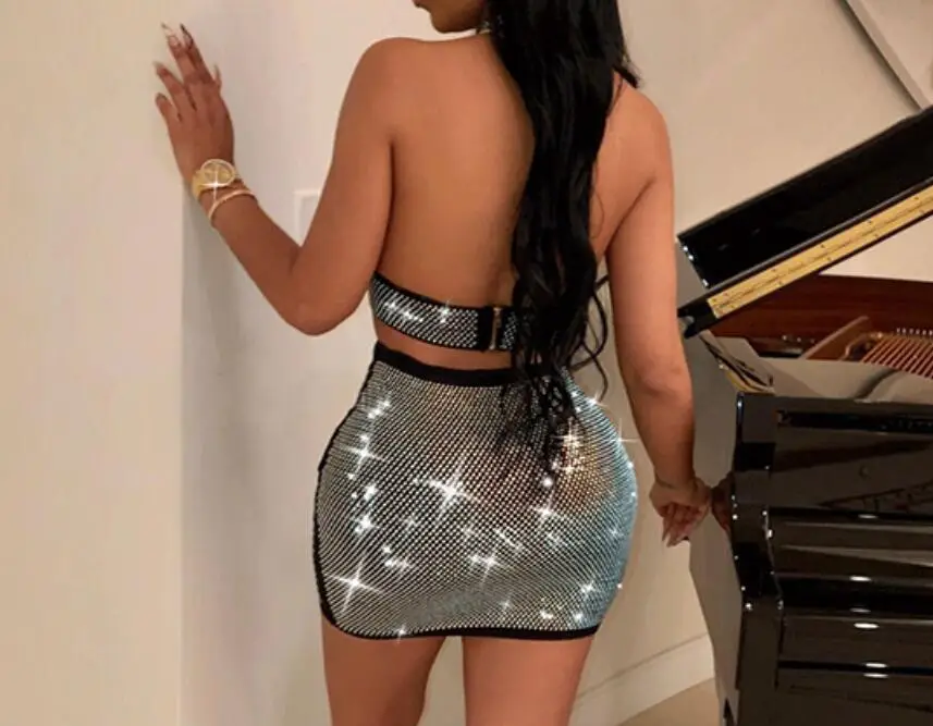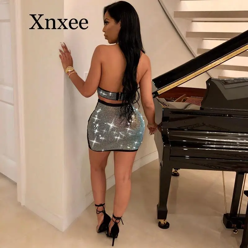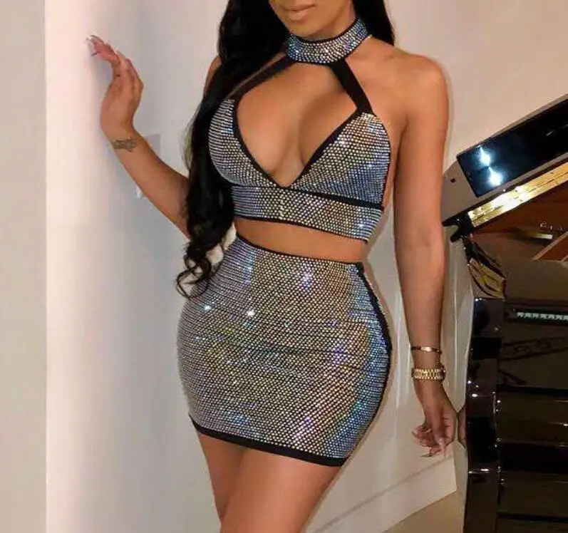 Buy diamond deep v Sparkle Crystal Embellished Skirt Set Two Piece Sexy Sleeveless Rhinestone Decorative White Skirt Set