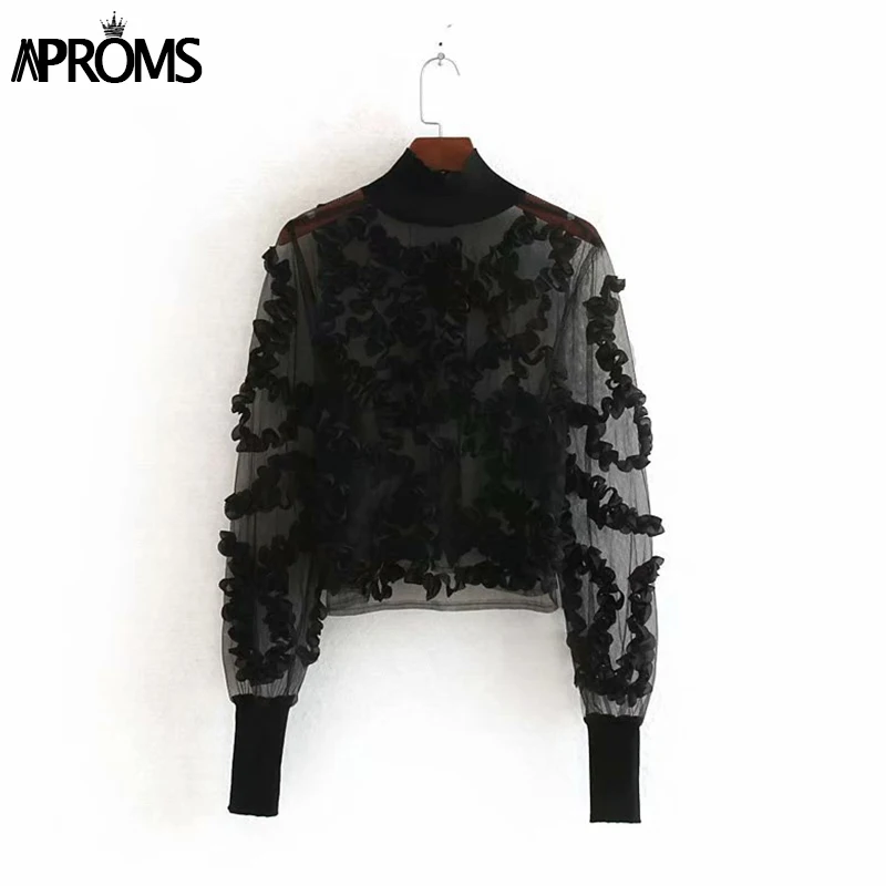 Images of Aproms Sexy Turtleneck Transparent Mesh T-shirt Women Lace Floral Long Sleeve Female Black Tops Fashion Streetwear Ladies Tees :