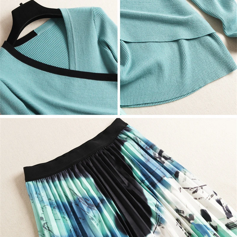Images of Fashion Designer 2019 Fall Winter 2 Piece Skirt Set Women Full Sleeve V Neck Knitted Sweater Top and Print Pleated Skirt Sets :