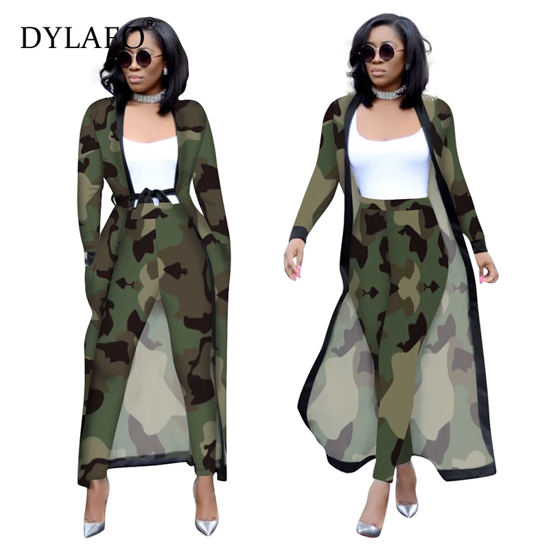 Best Offer Print Women Suit Elegant Long Cardigan Coat Top + Legging Pants With Pockets Belts 2 Piece Set Fashion Streetwear Female Outfits
