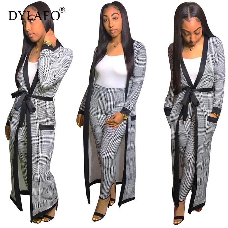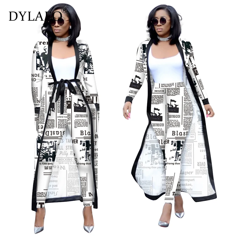 Images of Print Women Suit Elegant Long Cardigan Coat Top + Legging Pants With Pockets Belts 2 Piece Set Fashion Streetwear Female Outfits :