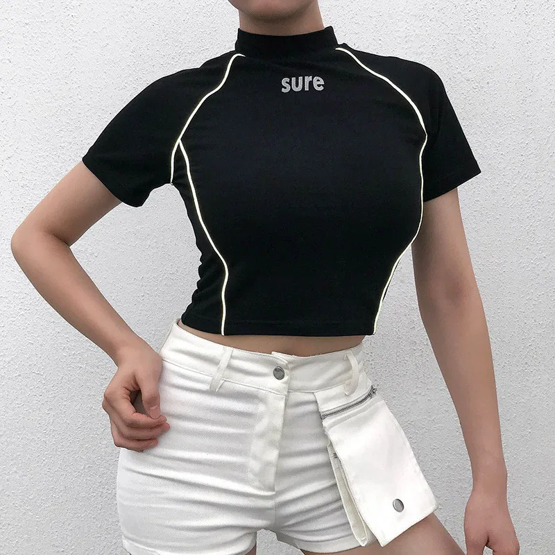 Sale Women Sexy Black Reflective Round Neck Tight-fitting Slim Short Sleeve T-shirt Women Summer Fashion Short Top Reflective T-shirt