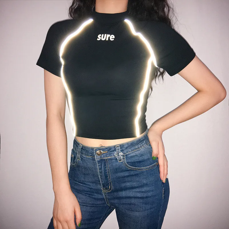New Women Sexy Black Reflective Round Neck Tight-fitting Slim Short Sleeve T-shirt Women Summer Fashion Short Top Reflective T-shirt
