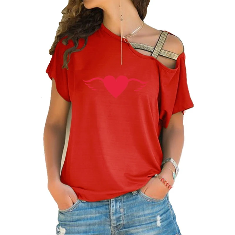 Images of 2020 Valentine Day Fashion Heart Print Loose Cotton T-Shirt For Women Cross Bandage Plus Size Female T-shirt Women Funny Cute :