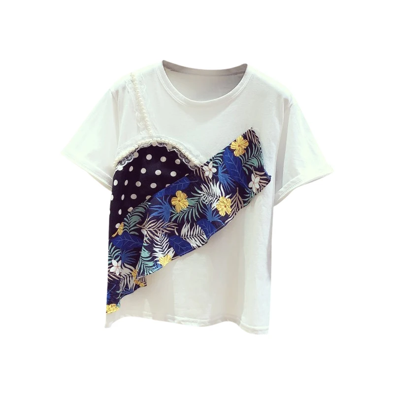New Tshirt Woman 2020 Spring Summer New Color Ruffle Beaded Panel Round Neck Short Sleeve T-shirt Women's Top Girls Student T-shirts