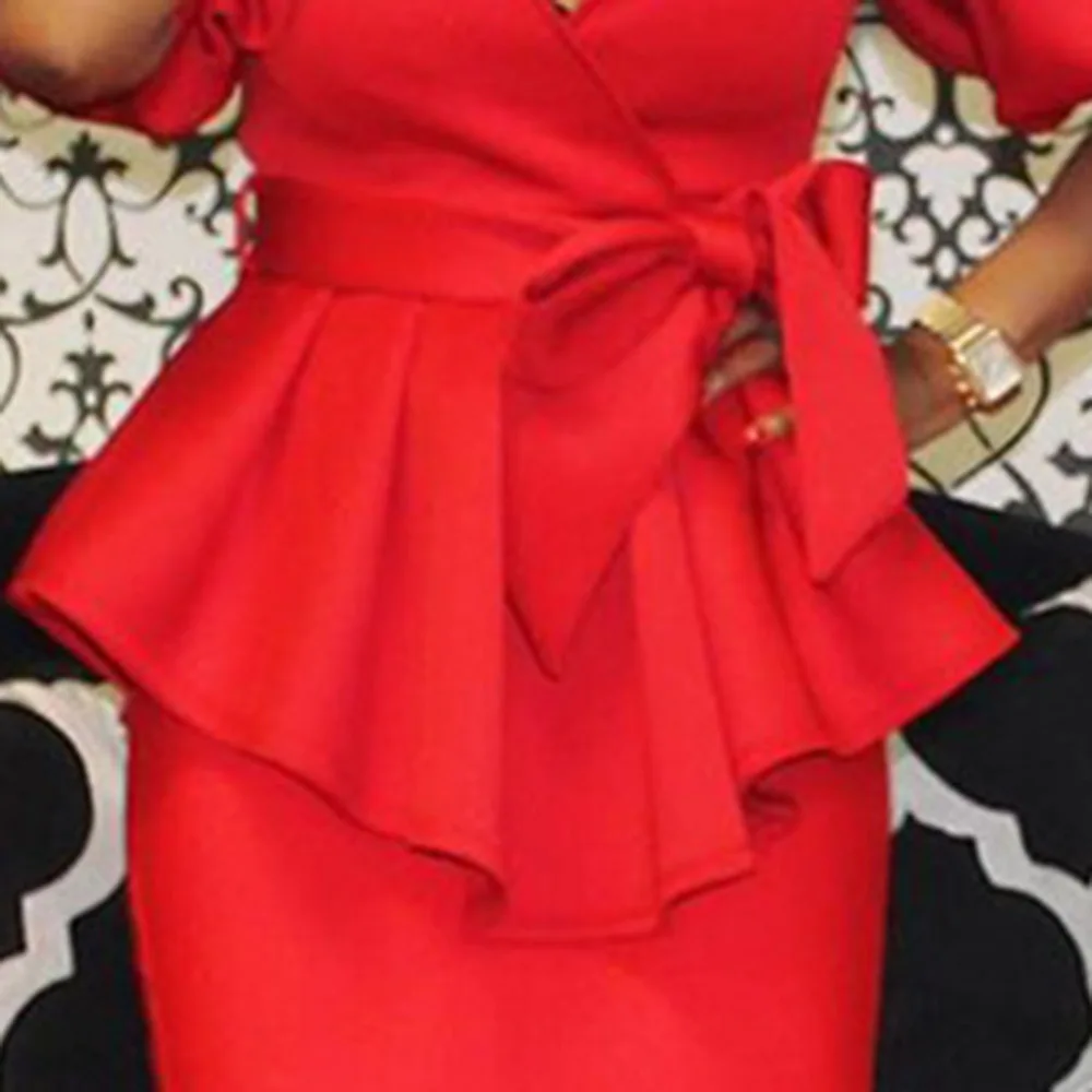 Sale Two Piece Sets Office Ladies Puff Sleeve and Bodycon Skirt Elegant Women Sets Party Dinner 2PCS Set Suits Plus Size 2XL Red