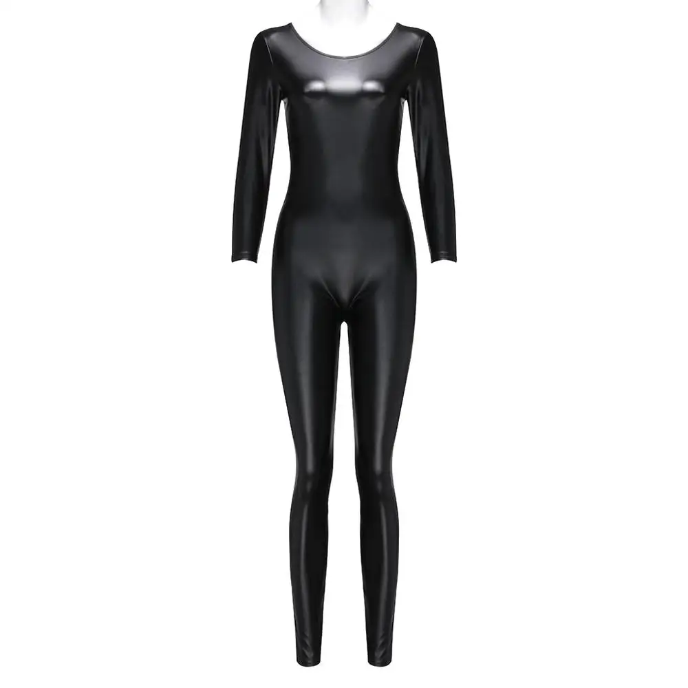 Images of Elastic Leotard Women Jumpsuits Black Plus Size Leather Zipper Sexy Leotard Long Sleeves Rompers Clubwear Monos de Fiesta 2020 Y :