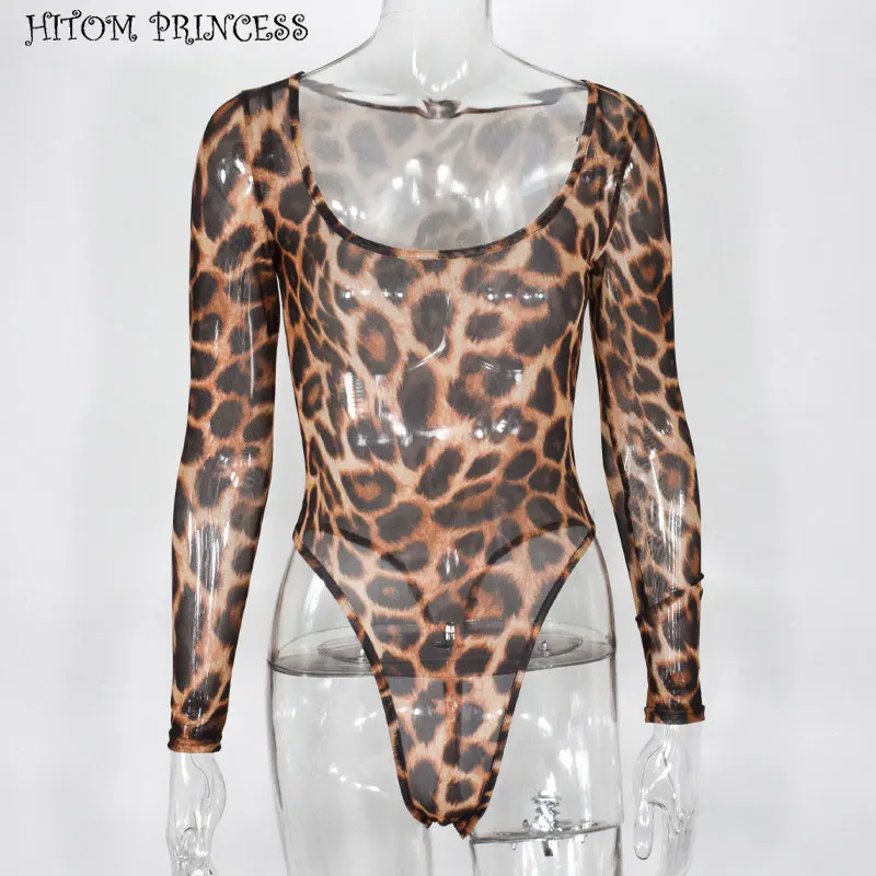 Images of HITOM PRINCESS Mesh Leopard Sexy Bodysuit Women Long Sleeve Bodycon Skinny Rompers Womens Jumpsuit Snake Print Playsuits Party :