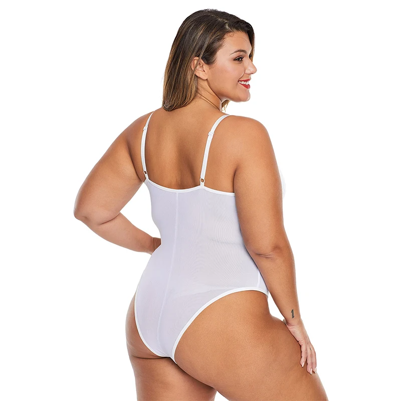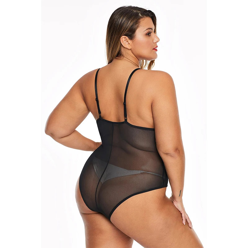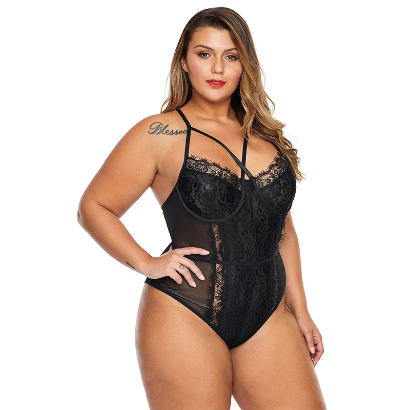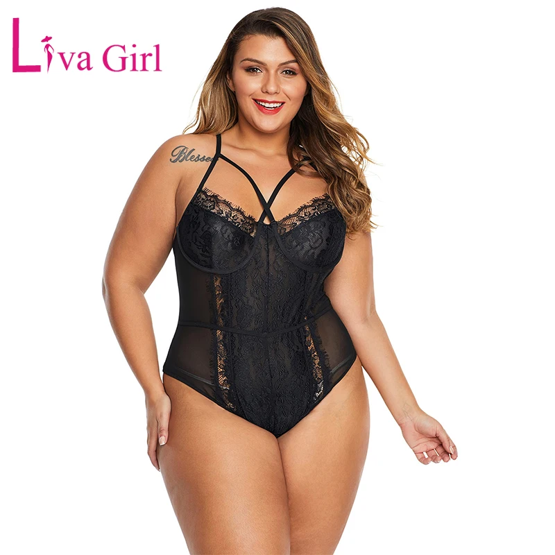 Images of LIVA GIRL Women Plus Size Teddy Bodysuit Black/White Sexy Sheer Cross Front Big Size Floral Lace Bodysuits Bodycon Jumpsuit Tops :