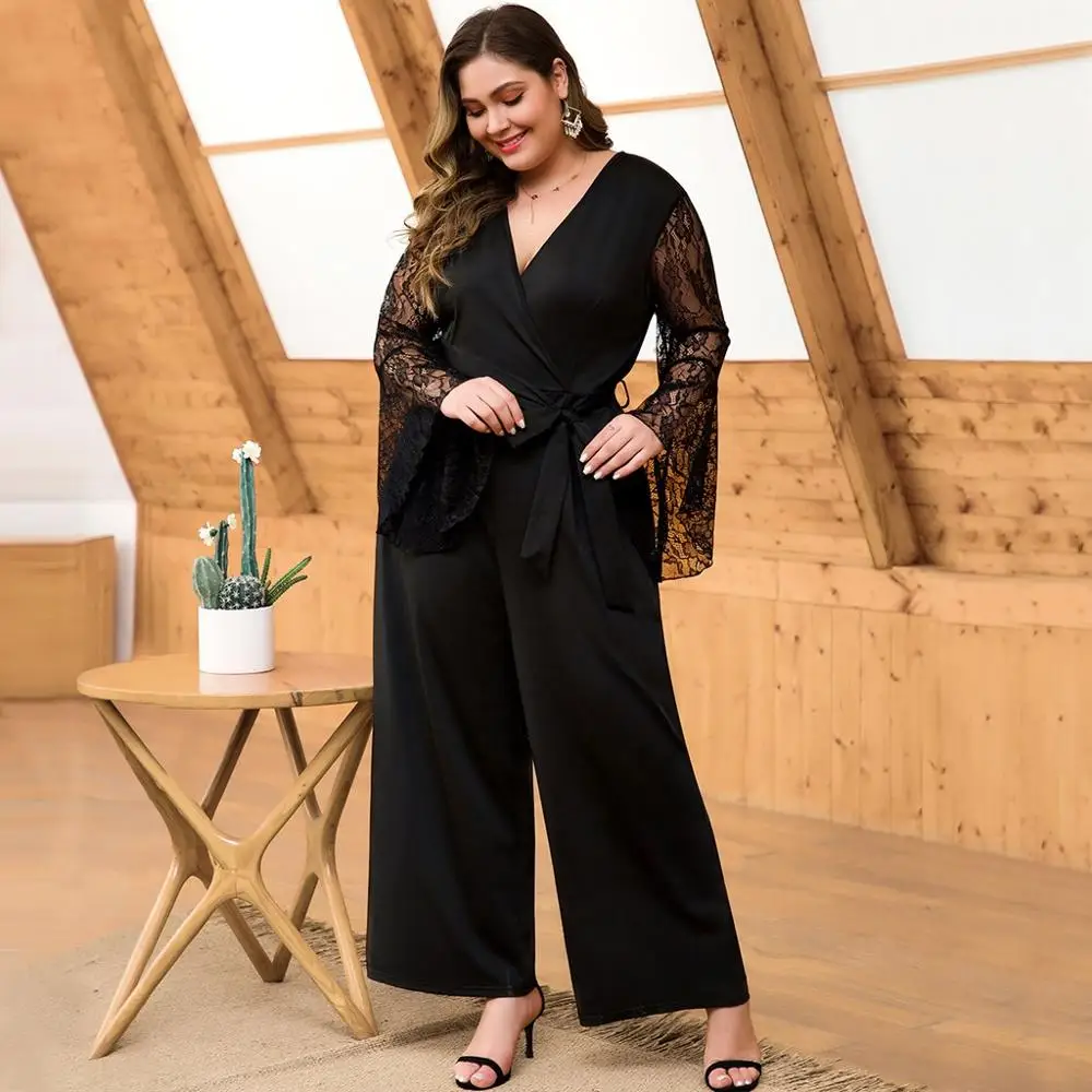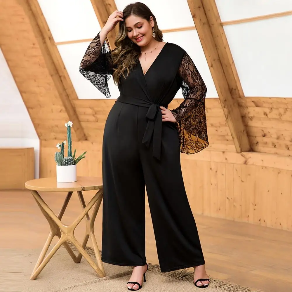 Get this Slim Fit Women Jumpsuit Sexy V Neck Lace Stitching Flared Sleeves High Waist Wide Leg Plus Size Jumpsuit Ropa Mujer 2020 New E with limited time discount by pressing the button below
