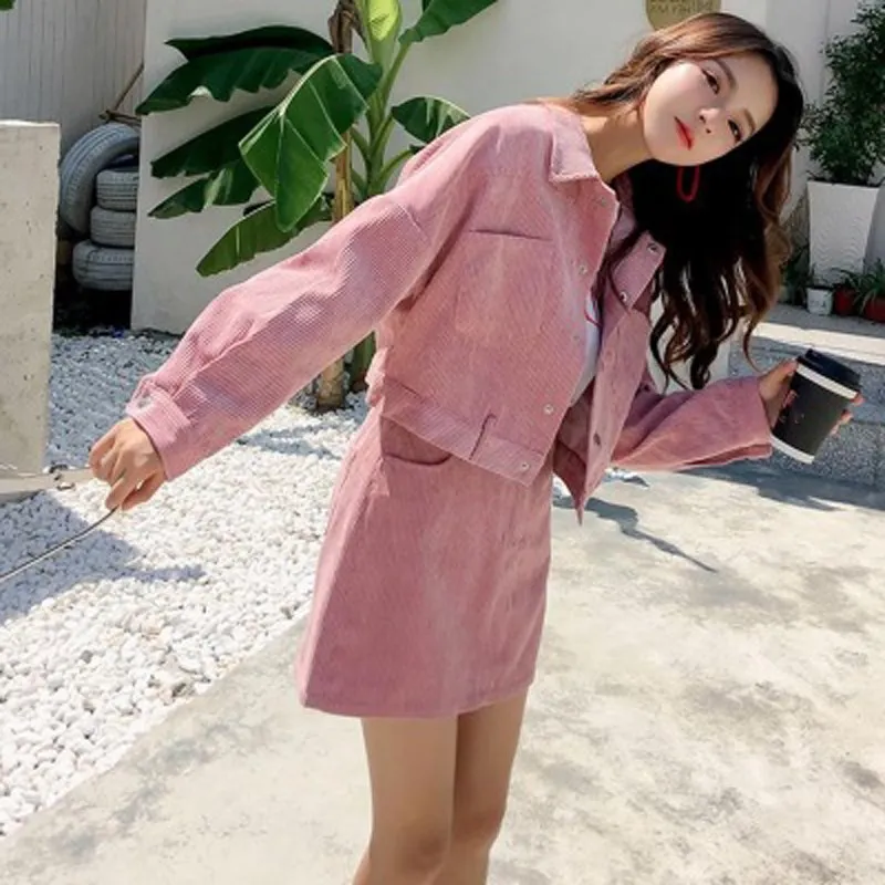 Best Offer Spring Fall Women Sweet Pink Casual Set Short Jacket Coat And Mini Skirt Suit Female Two Piece Corduroy Skirt Set