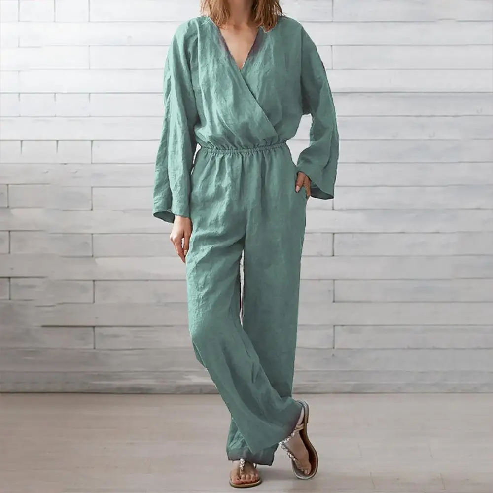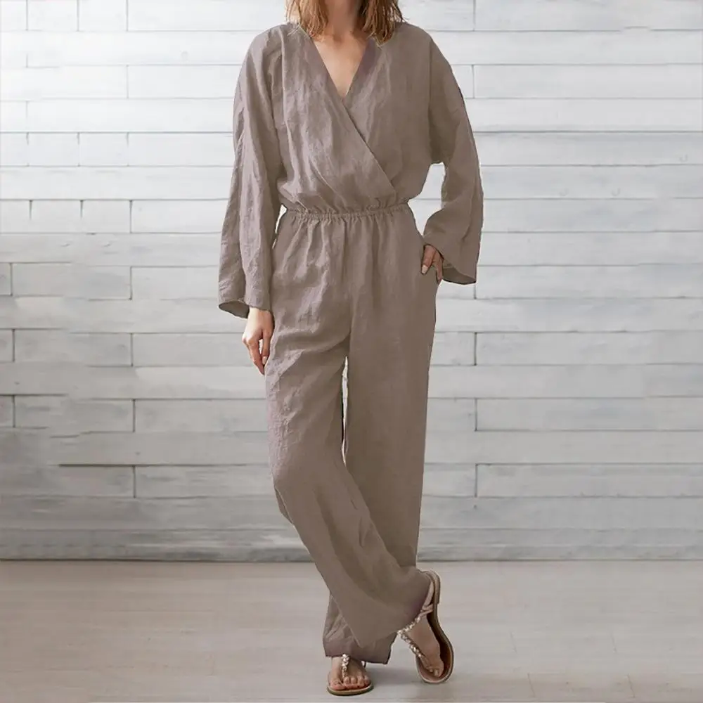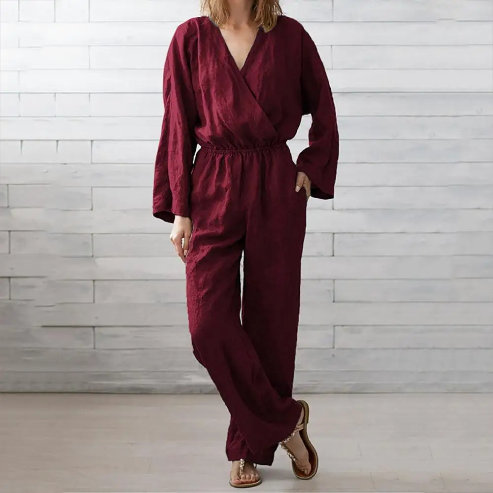 Buy Casual Loose Women Jumpsuit Solid Fashion Long Sleeve V Neck Elastic Waist Winter Spring Jumpsuit Ropa Mujer 2020 New Hot E