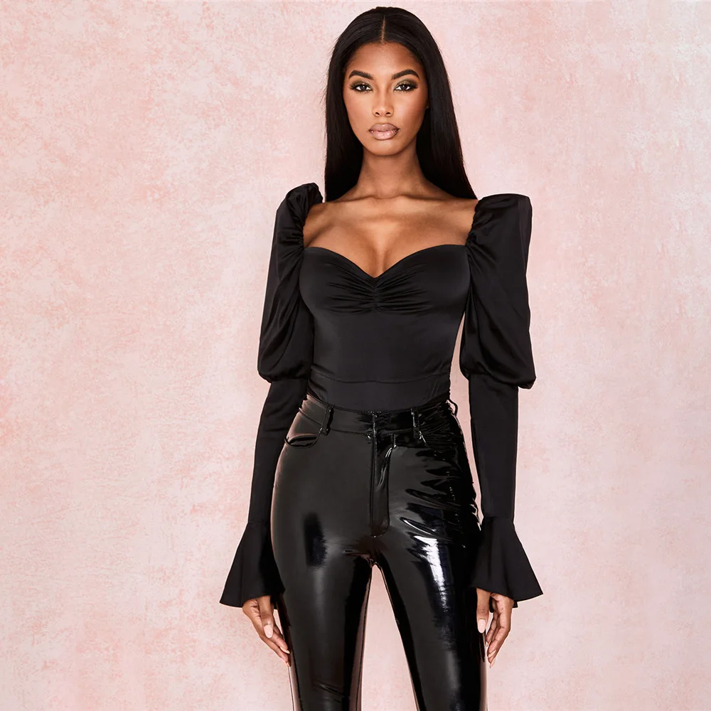Images of Cryptographic Sexy Black Bodysuits Solid Backless Puff Sleeve Bodycon Rompers Fashion Female Winter Body Suits Elegant Skinny :