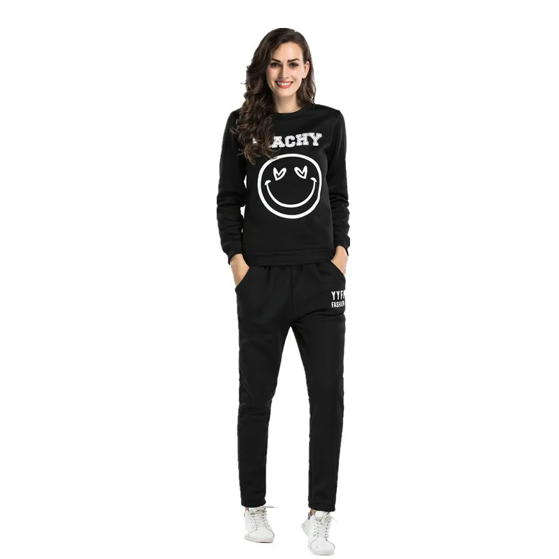 New Casual pants suit women's two piece set happy smile face printing sportswear crew neck wool pants women