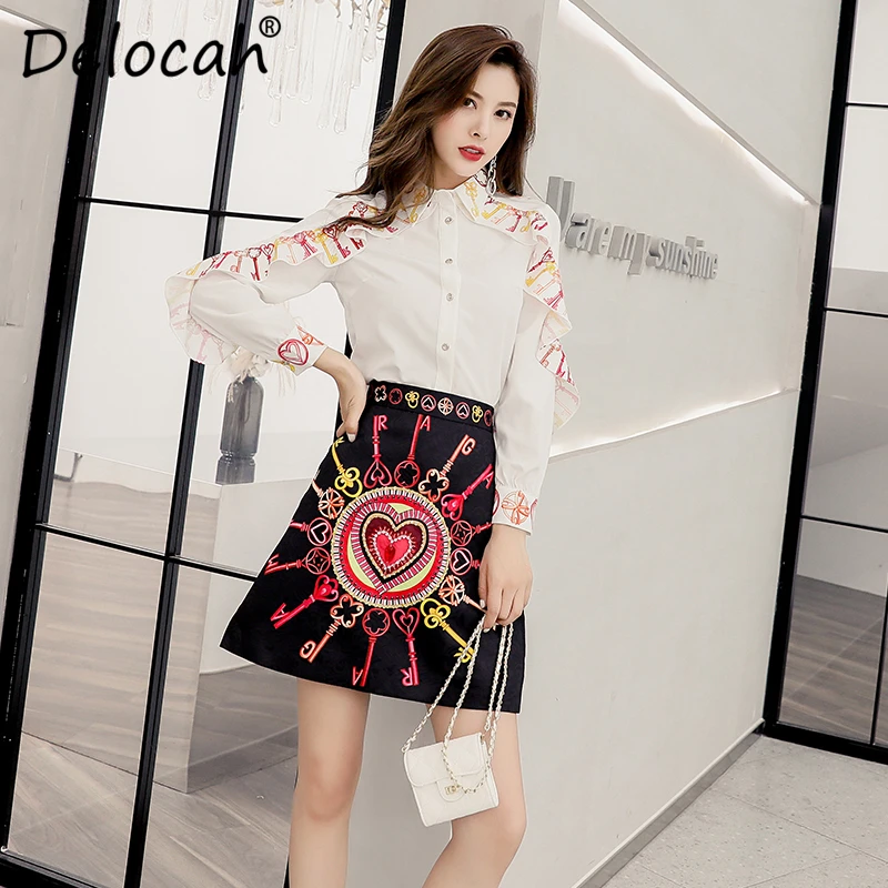 Images of Delocah 2019 Autumn Women Suits Runway Fashion Designer Long Sleeve Gorgeous Ruffles Blouses + Printed Slim Skirt Two Pieces Set :