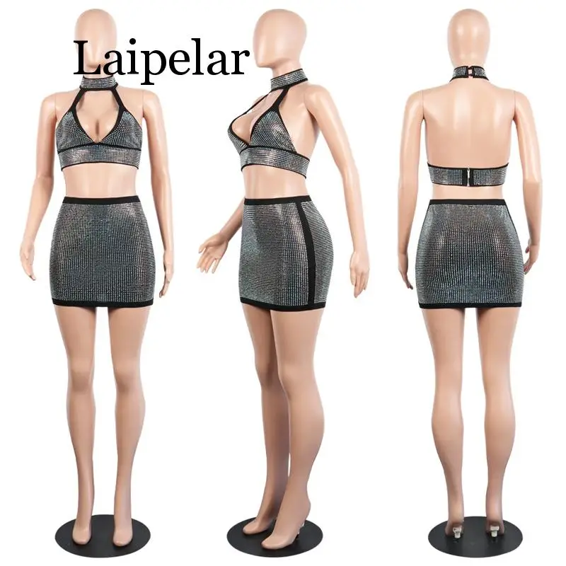 New Laipelar 2020 Women Diamonds Two Piece Set Dress Deep V Neck Sleeveless Open Back Halter Crop Top Mini Skirt Club Outfits