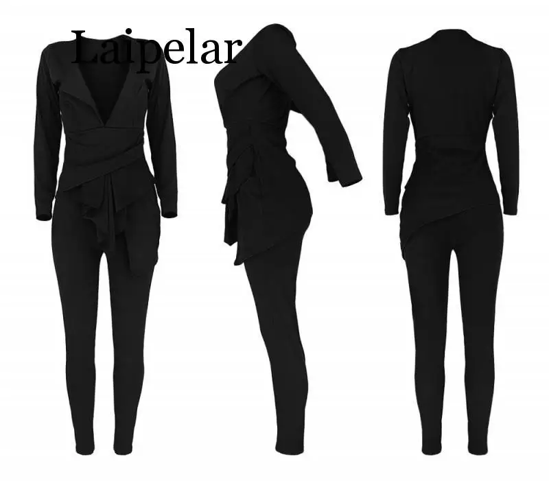 Images of Sexy Deep V Solid Women Two Piece Suits Autumn Long Sleeve Irregular Hem Female Matching Sets Winter Casual Club Black Outfits :