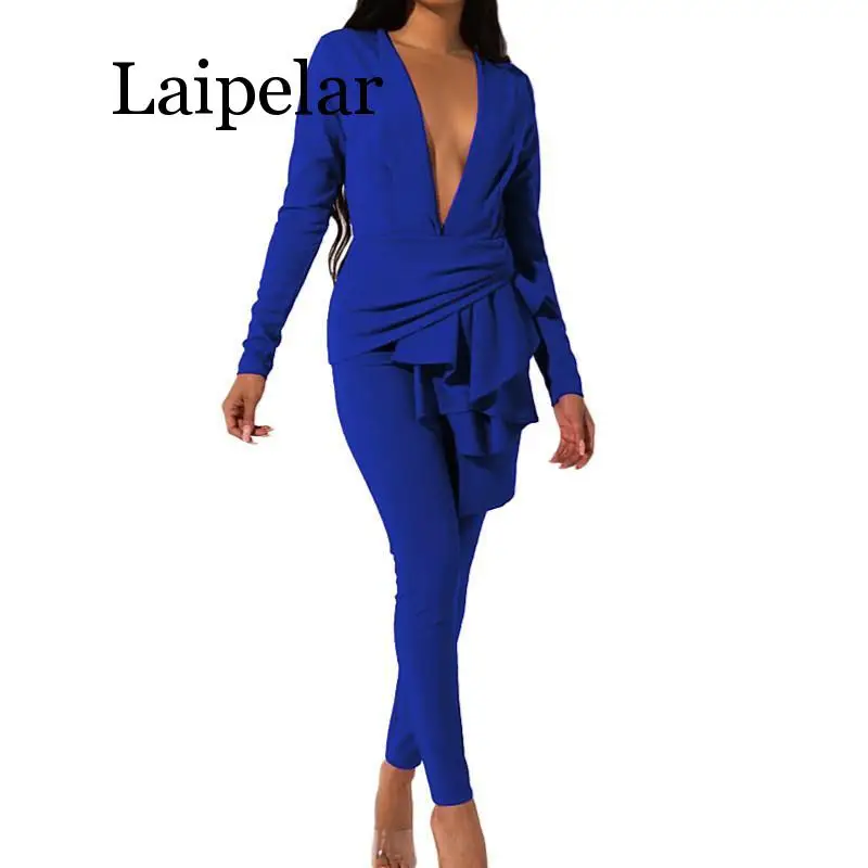 Sale Sexy Deep V Solid Women Two Piece Suits Autumn Long Sleeve Irregular Hem Female Matching Sets Winter Casual Club Black Outfits