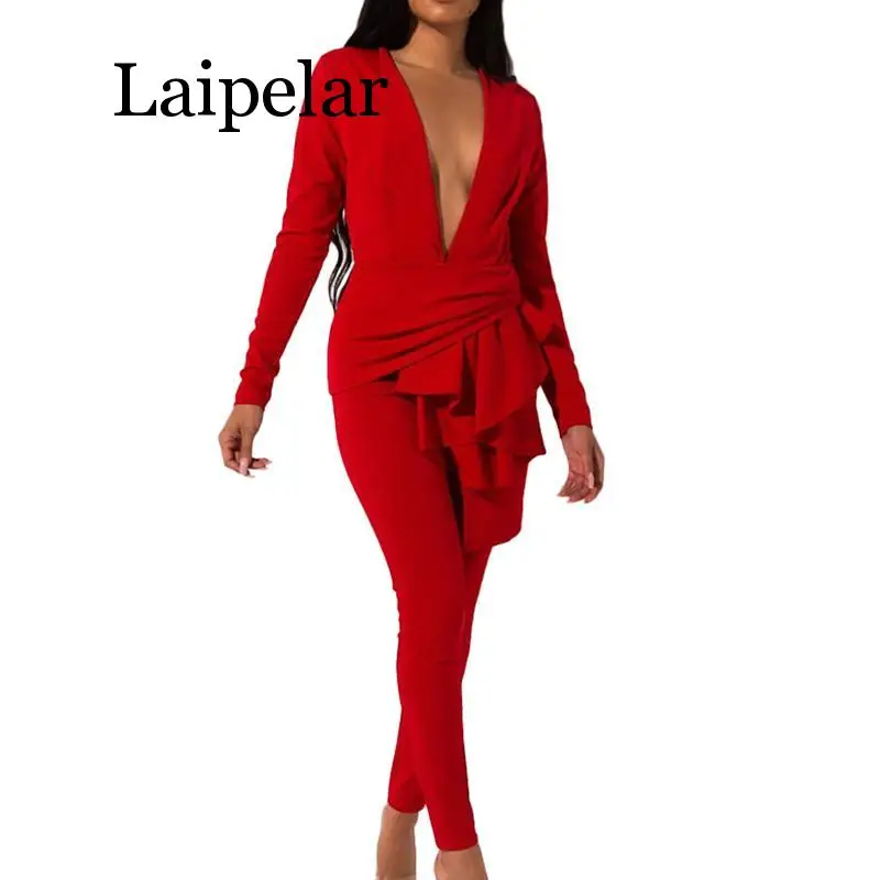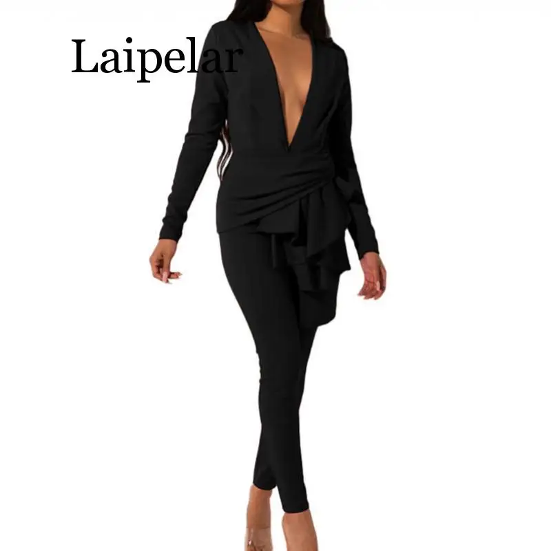 Get this Sexy Deep V Solid Women Two Piece Suits Autumn Long Sleeve Irregular Hem Female Matching Sets Winter Casual Club Black Outfits with limited time discount by pressing the button below