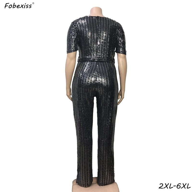 Promo Glitter Jumpsuit Women Summer Plus Size 5XL 6XL Club Party Sequin Jumpsuit Short Sleeve Sexy V Neck Overalls Lady Belt Jumpsuit