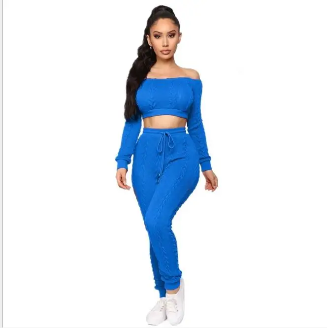 Images of gym running slash neck Knitted 2 Piece Set Women Long Sleeve Crop Tops And Long Pants Sexy Winter Sweater Two Piece Set Outfits :