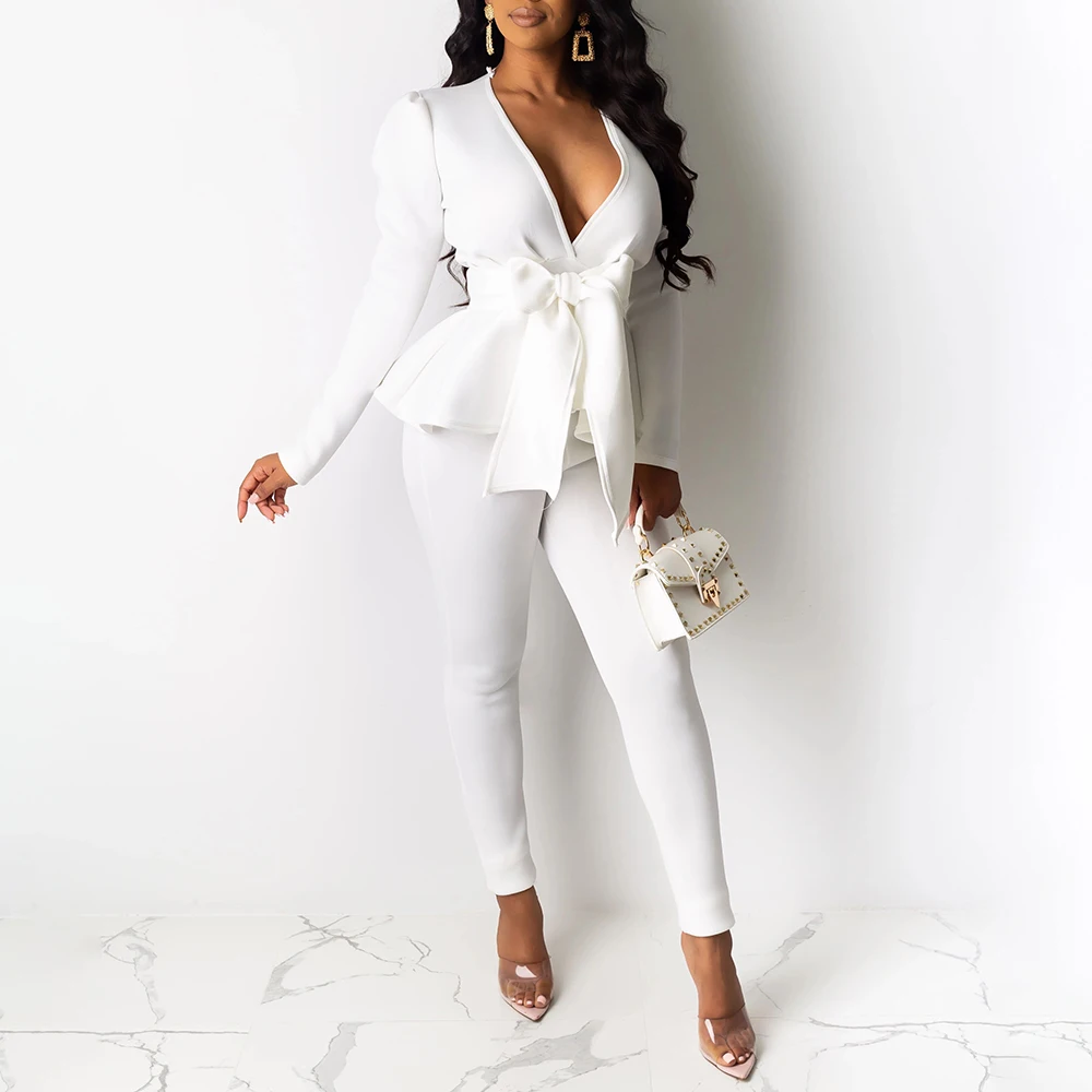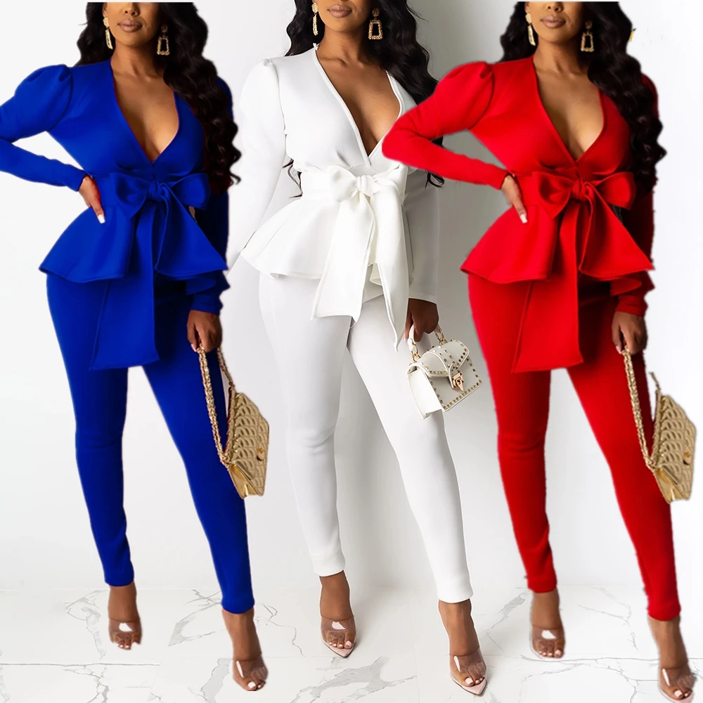 Images of Party Two Piece Sets Elegant Office Ladies Sexy V-Neck Solid Coat and Slim Pencil Pants Suits Sets Fashion Women Set Plus Size :