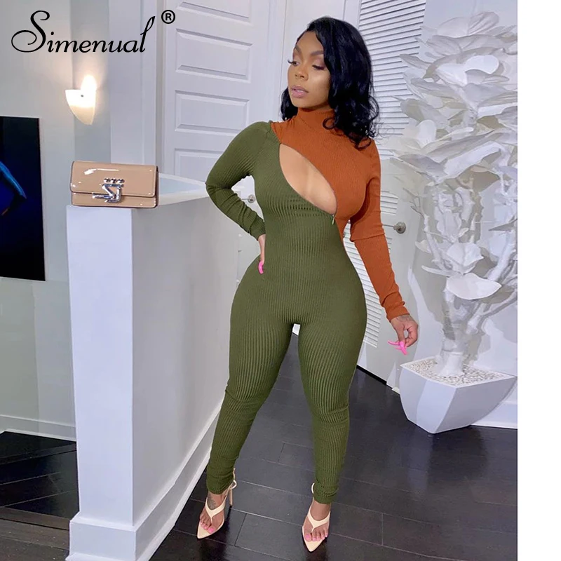 Promo Simenual Patchwork Zipper Fitness Rompers Womens Jumpsuit Casual Workout Sporty Active Wear Fashion Long Sleeve Skinny Jumpsuits