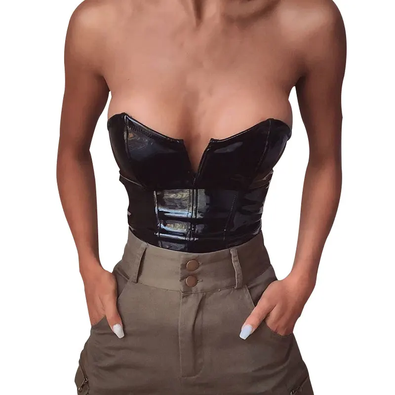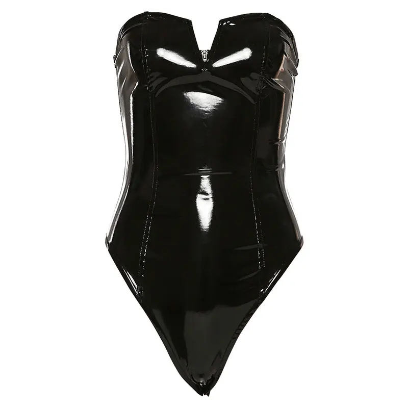 Images of Women Black PU Bodysuits Sexy Sleeveless Backless Women's Jumpsuit Spring New V-neck Skinny Rompers 2020 :