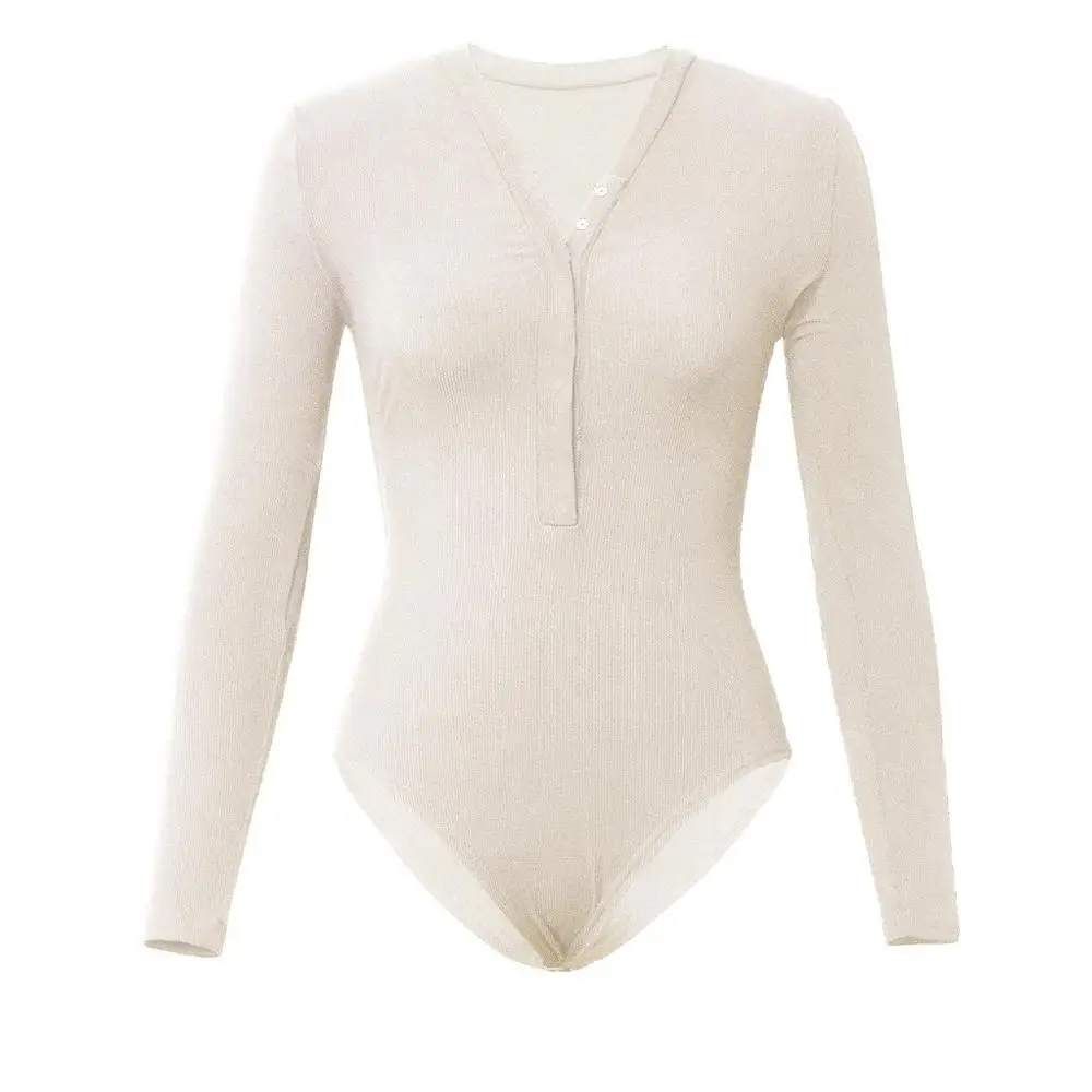 Images of Women Bodysuits Buttons Sexy Autumn Winter Bottoming V Neck Solid Color Long Sleeve Skinny Jumpsuit Bodis de Mujer 2020 New E :