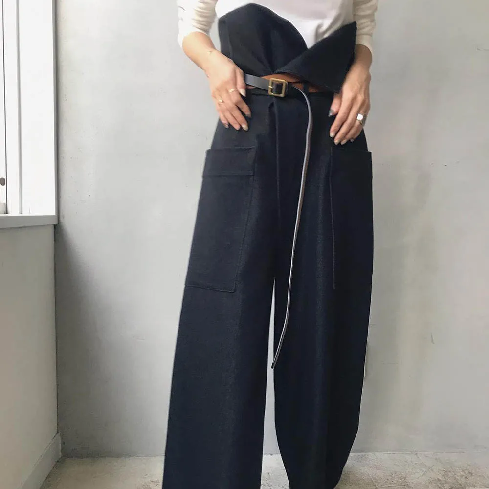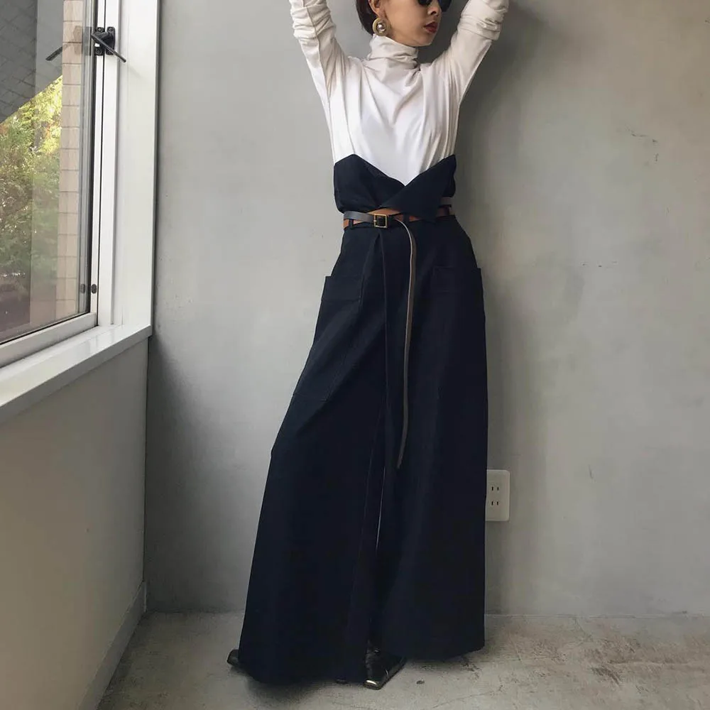 Images of Loose Wide Legs Jumpsuit Women Korean Elegant Long Sleeve White T-shirt and Denim Cloth Patchwork Fashion Rompers Long Playsuit :