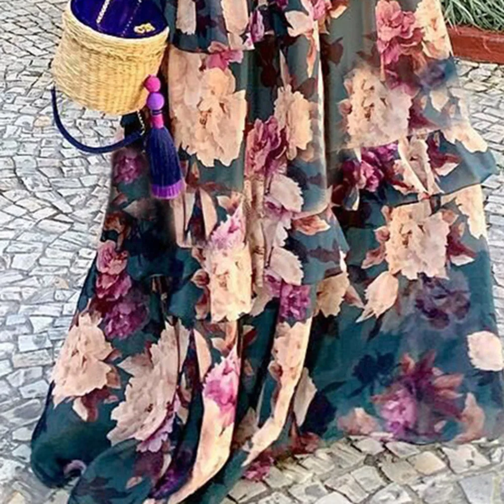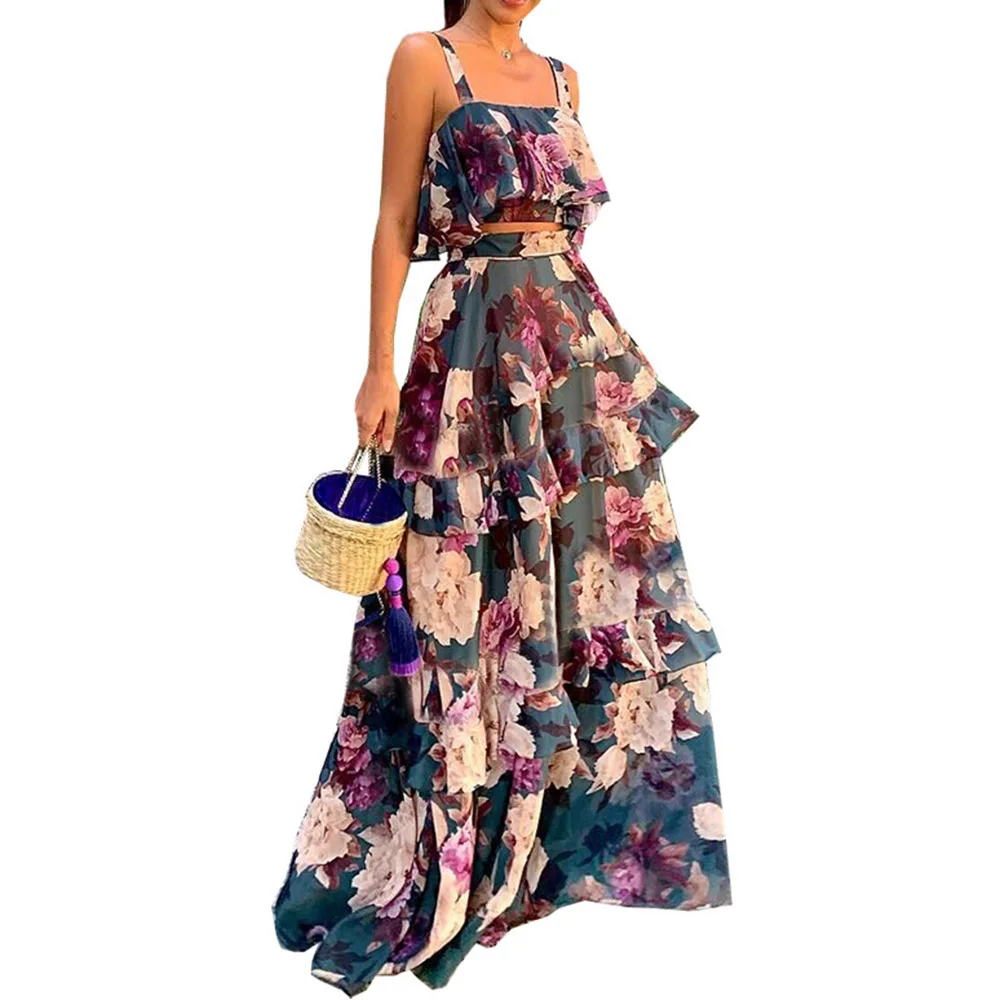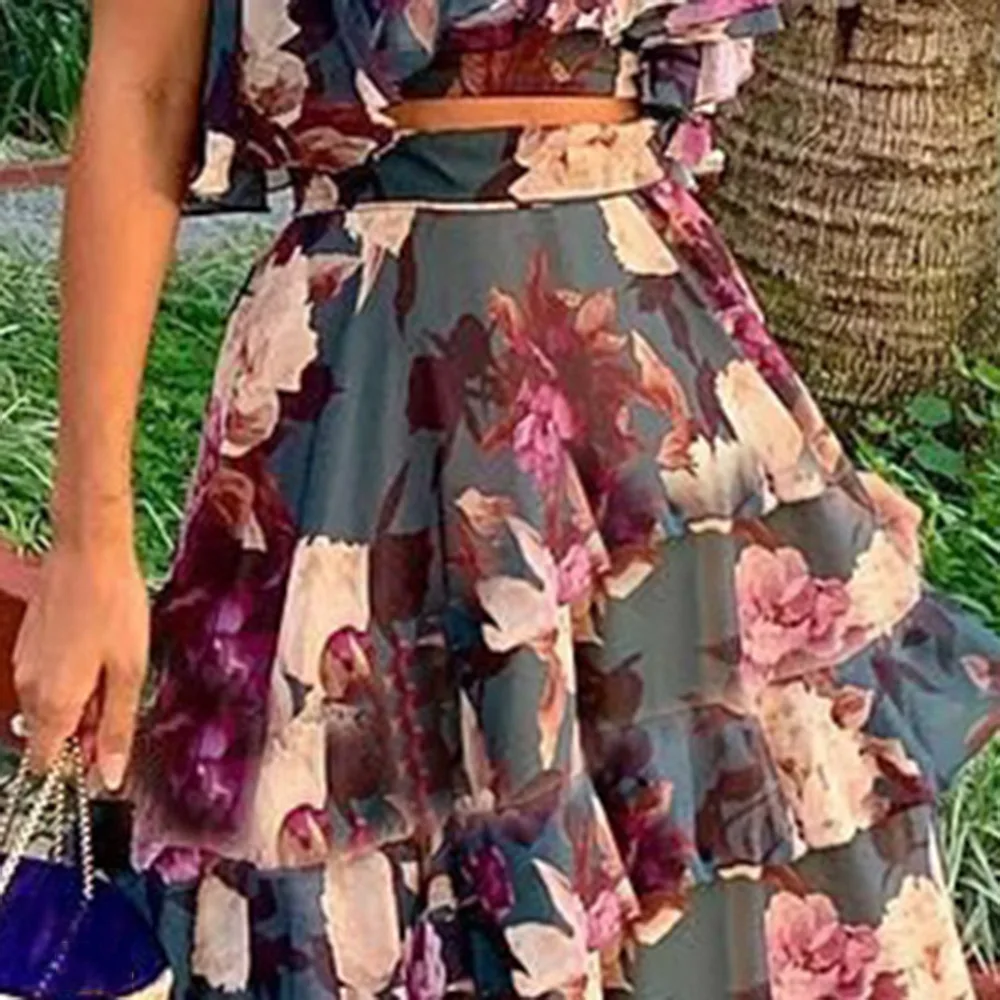 Sale Two Piece Sets Summer Sleeve Crop Top and Ruffles Layered Dress Retro Floral Printed Women Sets Boho Maxi Causal Suits Purple