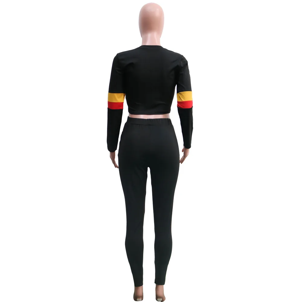 Sale Women Tracksuit Two Piece Set Casual Leopard Stripe Patchwork Long Sleeve Crop Tops T-Shirt Pencil Pants Suit Outfit Soprt Set