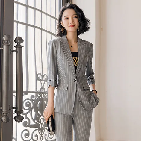 Sale 2020 Black Gray Female Elegant Stripes Women's Suit Set Blazer and Trouser Pant Business Uniform Clothing Office Lady Two Pieces