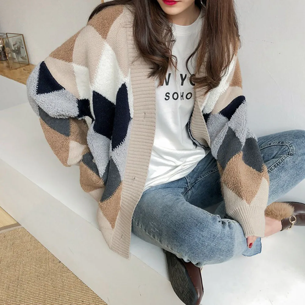 Images of Casual Oversize Plaid Cardigan Sweater Femlale Thick Warm Korean Knitted Coat Loose Outwear Knitwear Spring Winter jersey mujer :
