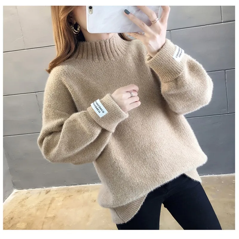 Images of Knitted Sweater Women Loose Solid Thick Turtleneck Pullover Sweater Jumpers Stylish Tops for Female Autumn Winter :