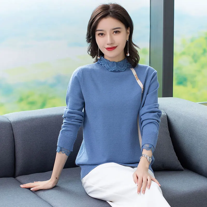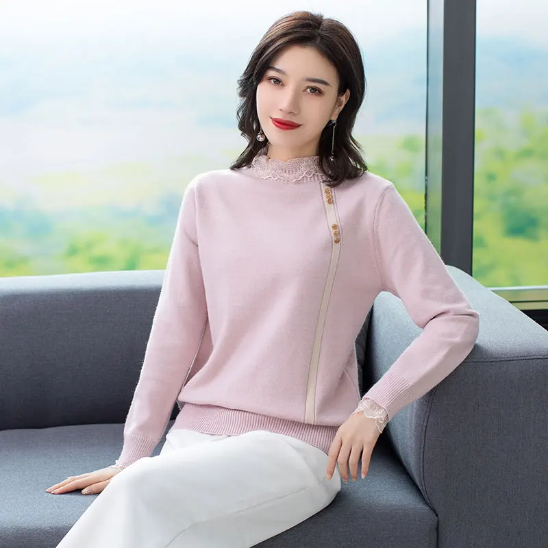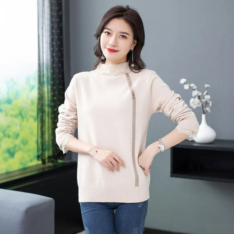 Promo Women Pullover Sweaters Lace Hem Design Half Collar Plain Knitwear Female Blue Pink Khaki Camel Trimming Knitted Pullovers 2019