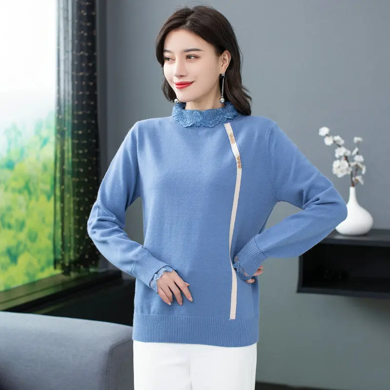 New Women Pullover Sweaters Lace Hem Design Half Collar Plain Knitwear Female Blue Pink Khaki Camel Trimming Knitted Pullovers 2019