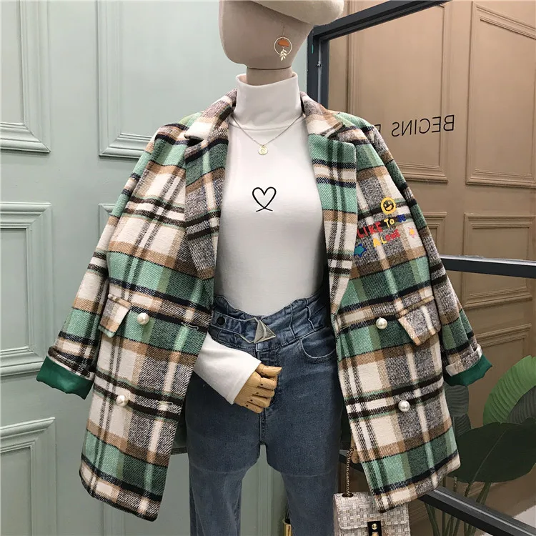 Images of Plaid Women Blazers Double Breasted Notched Embroidery Casual Women Blazers and Jackets Korean Fashion Clothing :