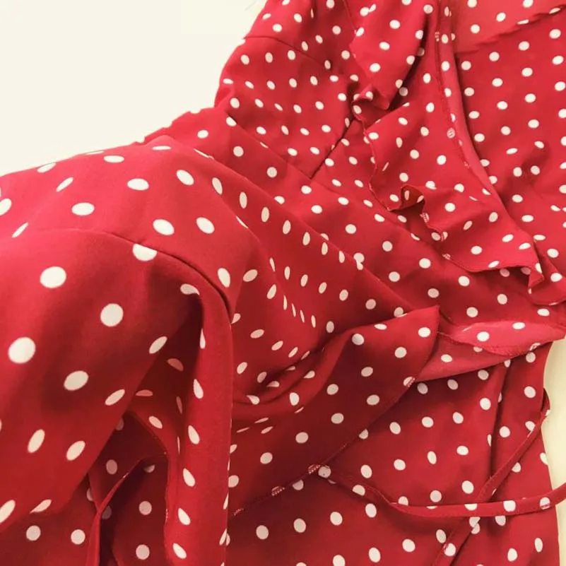 Images of 2019 Women's Summer Vintage Polka Dot Dress One Piece Beach Dresses Ruffled V Collar Waist Tie Irregular Ruffles Dresses :