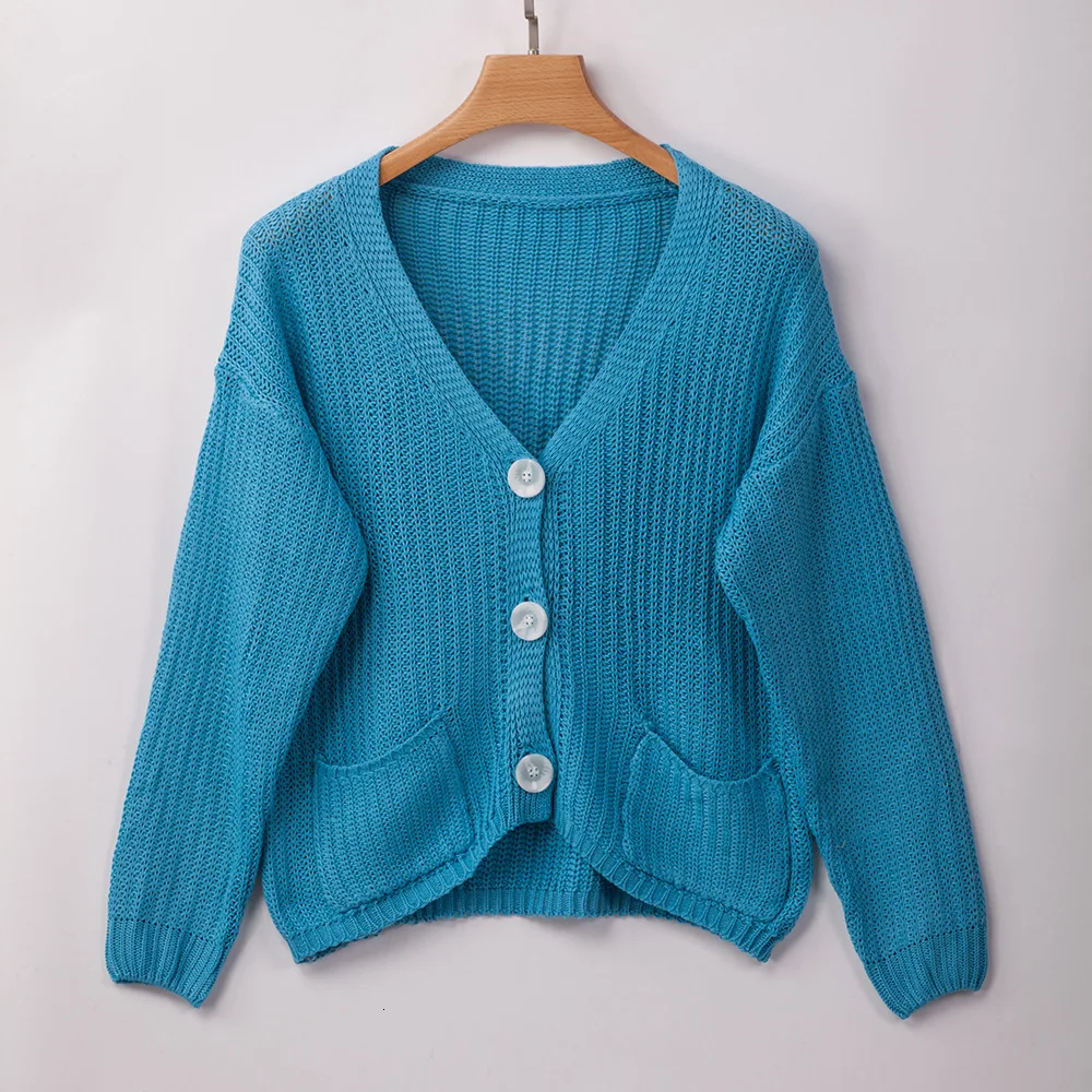 New V Neck Single-breasted Women Cardigan Pockets Long Sleeve Casual Knitted Sweater Outwear Ladies Solid Knitwear Damen Strickjacke