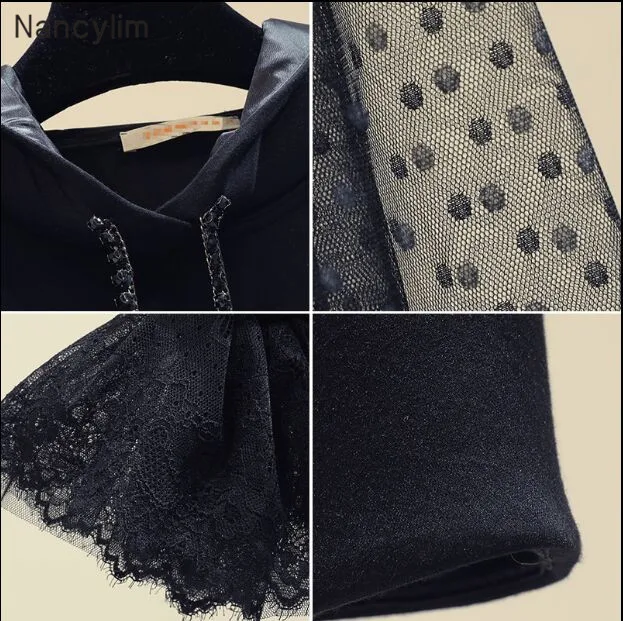 Images of Hooded Sweatshirt Women Spring Autumn Point Embroidery Hollow-out Horn Sleeve Crop Top Hoodie Students Black Hoodies Femme :