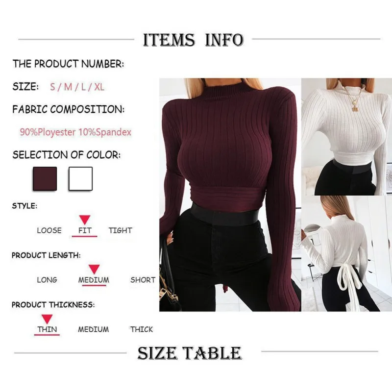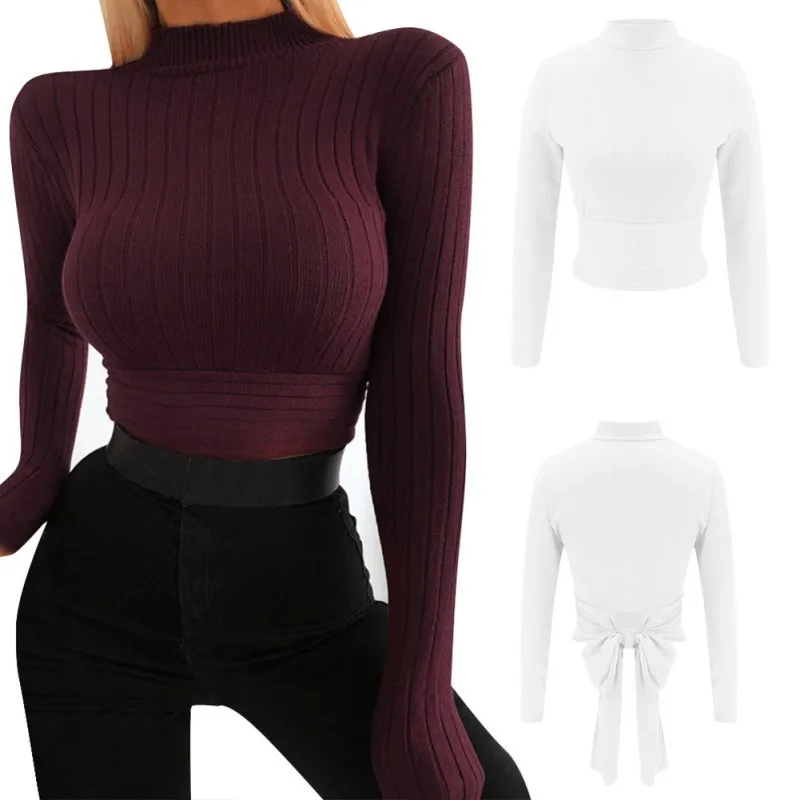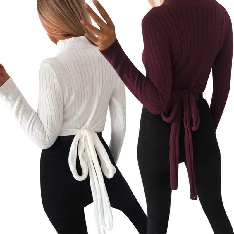 Buy Women Sweater Female Autumn Winter Sexy High Collar Short Tie Knot Solid Color Slim Long-Sleeved Lace Up Bottom Sweater W and R