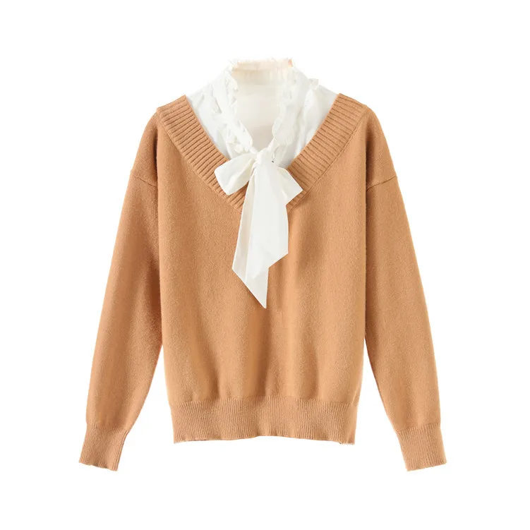 Best Offer 2020 Apricot Stitching Lotus Leaf Collar Loose Headband Long Sleeves Was Thin Knitted Sweater Women