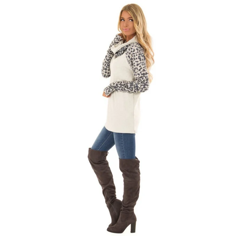 New Fashion Scarf Collar Leopard Stitching Top Slim Fit Warm Top For Women XL